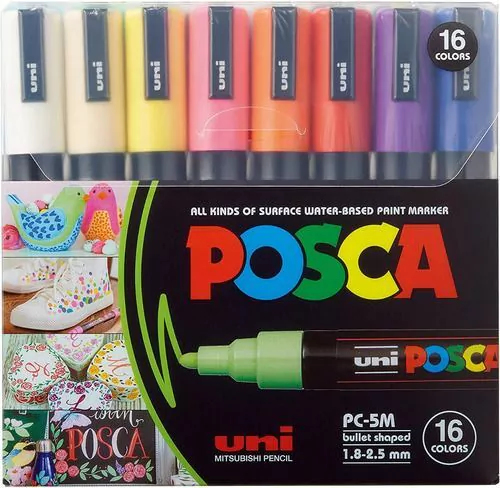 POSCA é um marcador à base de água, atóxico e sem solventes, que facilita seu trabalho por ser uma caneta multiuso, servindo para vários tipos de superfície tais como: papéis, telas, paredes, madeiras, vidros, plásticos, borrachas, cerâmicas, porcelanas, metais, entre outros.